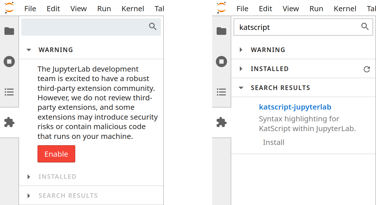To install via the JupyterLab extension manager, enable it and search for KatScript: